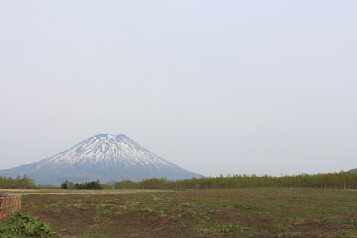 ニセコ手前の真狩神社の桜並木と羊蹄山