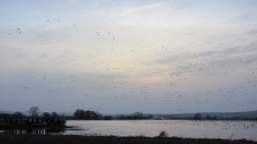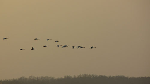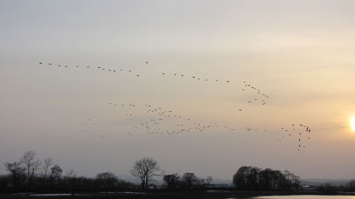 お天気がよさそうなので、宮島沼で羽を休めているマガンのねぐら立ちを見に