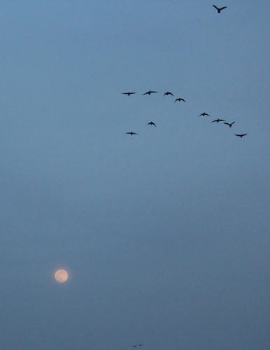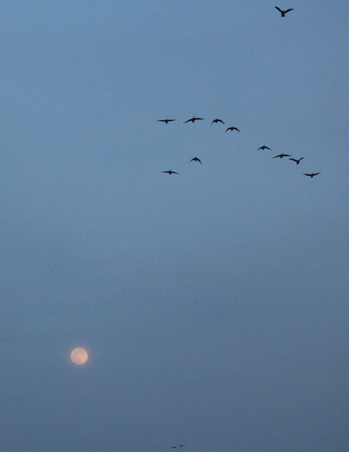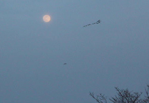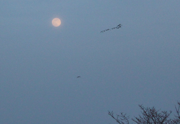 ちょうど満月だったので、「月に雁」を狙ってみるけど(ほかのカメラを構えた