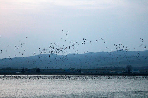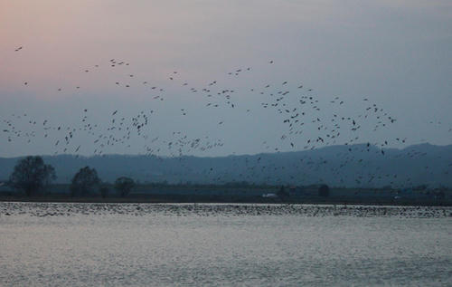 帰りに美唄市の宮島沼に立ち寄り、マガンのねぐら入りをお出迎え。