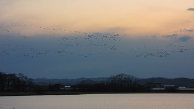 せっかくなので、明日(今日)の早朝のマガンのねぐら立ちを見に行こうと