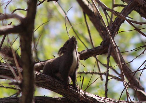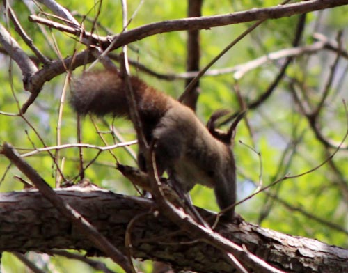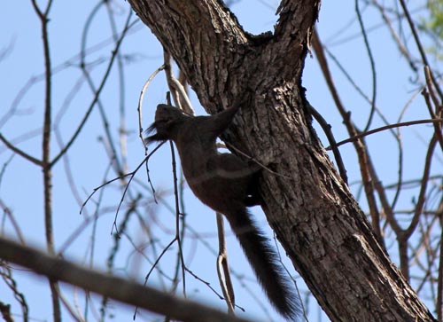 エゾリスが細い枝を咥えて、木の上に何度も運んでいた。