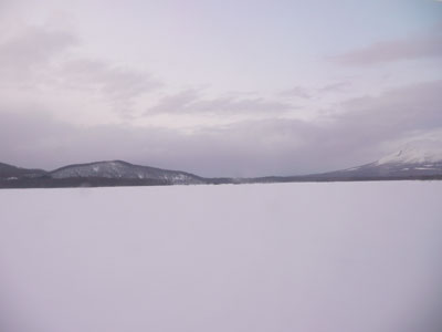 いろいろ考えながら、JRの車窓から写した凍結した大沼と駒ケ岳・・・