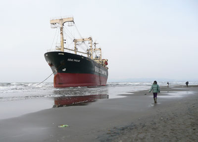 砂浜には異様な姿の貨物船。