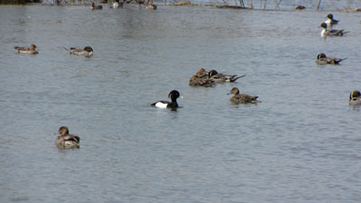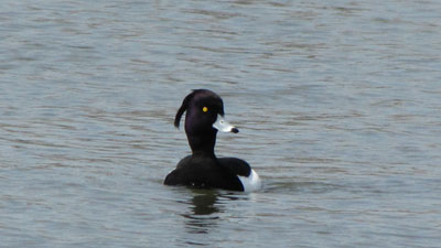 白鳥や他のカモ類に混じって、くっきりとツートンカラーで目立っていたキンクロハジロ。