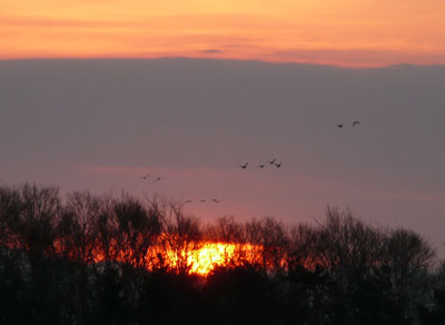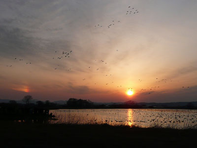 日没間際、マガンもあちこちから大急ぎで帰宅