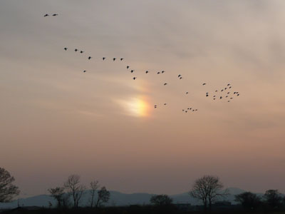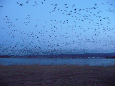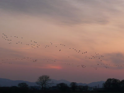 マガンたちはすでに、ねぐら入りをはじめていた。