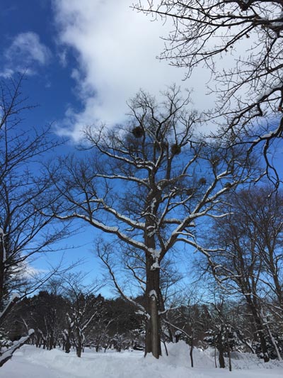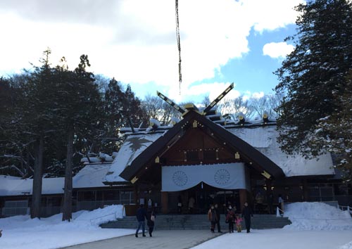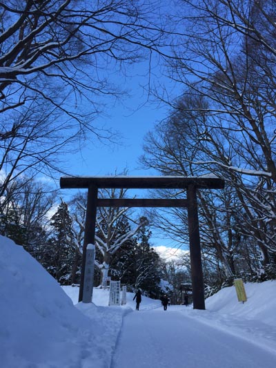 晴れていたのでぶらぶらと雪道を歩き、小鳥観察をしつつ神宮へ到着。