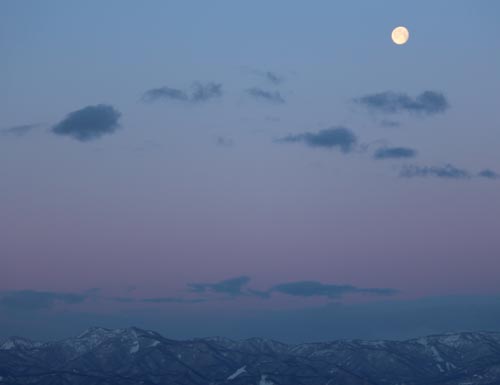 空に青みが増すにつれ、月は透き通るように落ちていく。