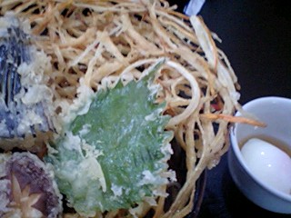 私が注文した野菜天そば。てんぷらが丼からかなりはみ出ていた^^;