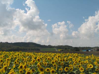 千歳あたりの畑地では緑肥用の向日葵が満開。